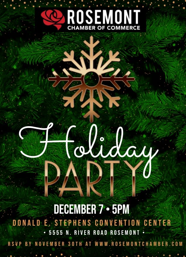Celebrate the holidays with your fellow Rosemont Chamber of Commerce chamber members! Guests will enjoy delicious food and drinks by Rosemont Catering, DJ, and photobooth. Complimentary parking will be available for our members. Phenomenal raffle prizes with proceeds benefitting Rosemont Helping Hand.